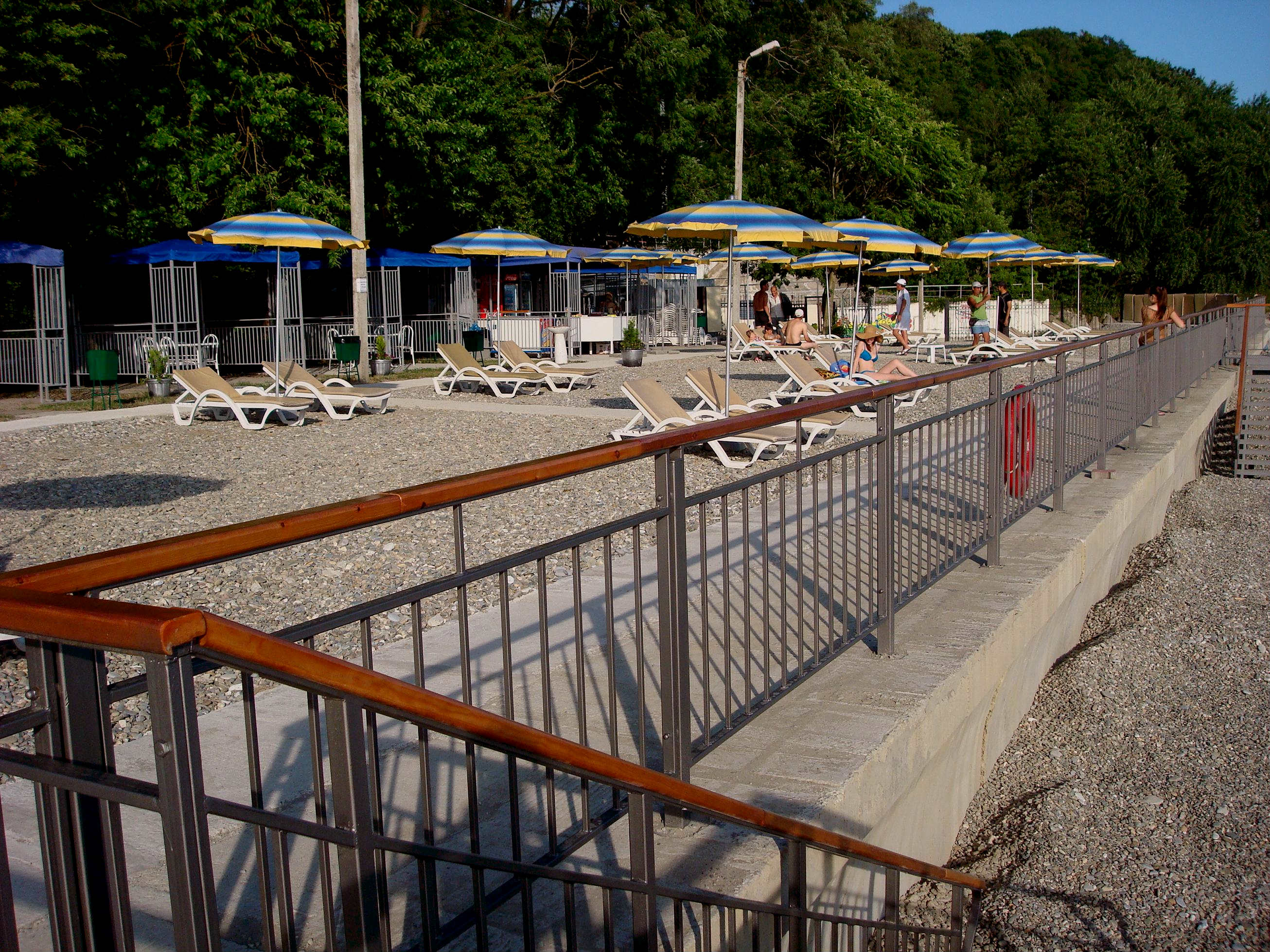 Пляжная полоса широкая с мелкой галькой, пологим заходом в воду – здесь очень удобно отдыхать с маленькими детьми. Вода чистая, всегда дежурят спасатели, есть медицинский пункт. Работает кафе.
